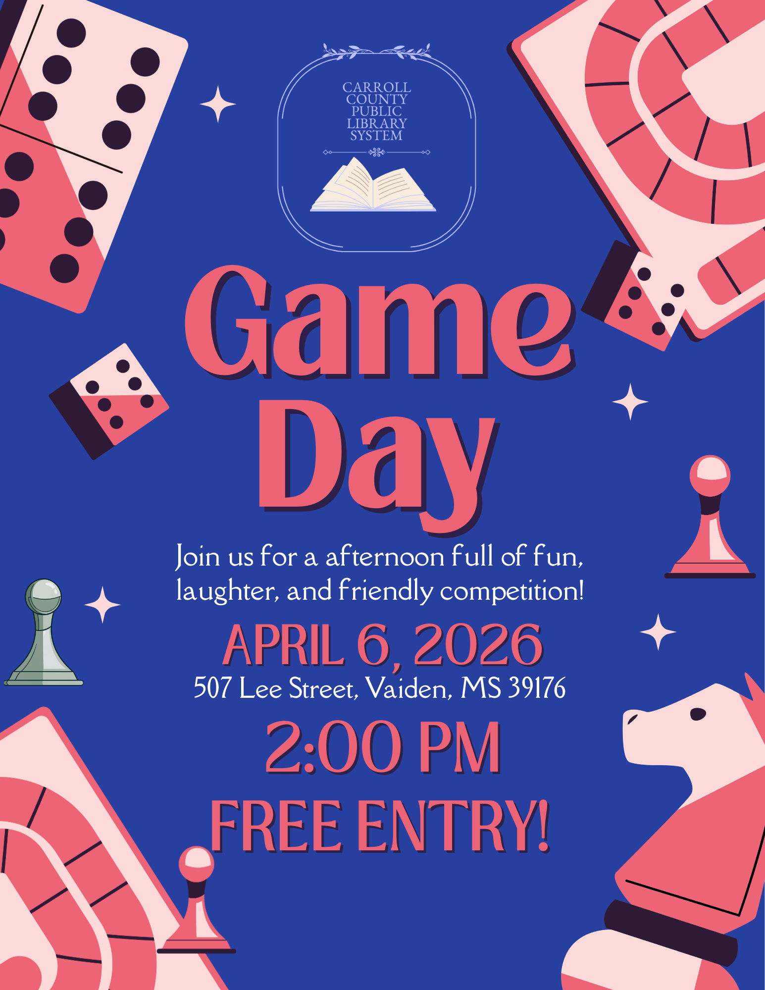 Events at the Carrollton-North Carrollton Public Library Holidays and Announcements Events at the Vaiden Public Library Bingo! Rock Painting Game Day! Game Day